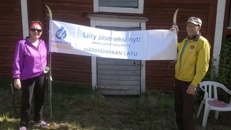 Eskolan talon piha-alueella Härmänmaan ladun esittelyssä Tarja Fagerholm ja Raimo Siltala. Aisaparin järjestämässä tapahtumassa mukana myös muita yhdistyksiä. 10.6.2017 |